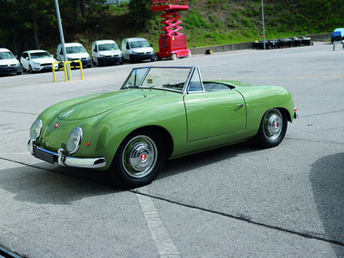 Während sich der mögliche zukünftige Besitzer von DK25 seine Wunschfarbe noch frei wählen kann, erstrahlt DK28 in einem außergewöhnlich schönen grünen Pastellton. Unter der Glanzschicht verborgen, ein sehr frühes Voll-Aluminiumkleid. DK28 wurde im Mai 1954 in Portugal zugelassen. Erstbesitzer war Joaquim F. Nogueira, der stets hervorragende Klassenplatzierungen bei Rennen und Rallyes in Portugal herausfuhr. Sehr geschmackvoll abgestimmt zur Außenfarbe, der Innenraum im dunkleren Grünton. In dem bei Bedarf drei Personen nebeneinander Platz nehmen können. Während der Fahrer über einen Einzelsitz verfügt, bietet das Beifahrergestühl zwei Kuschlern eine Mitfahrgelegenheit. Hinter den verchromten Sitzgestellen befindet sich ein Stauraum für Gepäck und Verdeck. Welches beim DK28 vorhanden ist, jedoch aufgearbeitet werden muss. Der 45 PS starke 1300er-Motor atmet über zwei Doppelvergaser. Beschleunigt den 90 Zentimeter flachen und 650 Kilo leichten Roadster bis auf 150 km/h Höchstgeschwindigkeit. Bei derart rasanter Fahrt sorgen die zweiteilige Front- sowie Seitenscheiben für ausreichend Windschutz. Fensterkurbeln sucht man jedoch aus Gewichtsgründen vergeblich. Der Alu-Tank unter der Fronthaube fasst 65 Liter. Reichlich Volumen für 900 Kilometer Fahrstrecke. Außer man hat es besonders eilig.