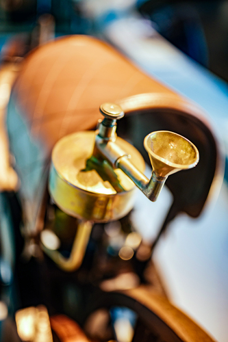 Vorsicht, Zündung Der kleine Messingtank mit Einfülltrichter und Pumpe hinter dem Fahrer sieht nach einem Benzinbehältnis aus. Er enthält auch Treibstoff – jedoch nicht für den Antrieb des Motors. Vielmehr versorgt der kleine Tank die Flamme der Glührohrzündung des Daimler-Motors. Dieser ist das Herz des Zweirads. Am 3. April 1885 meldet Gottlieb Daimler den schnelllaufenden Motor mit stehendem Zylinder zum Patent an. Der Spitzname wegen des charakteristischen Aussehens: „Standuhr“.