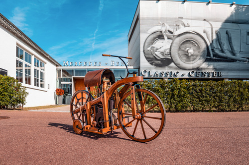 Balanceakt mit Stütze Daimler und Maybach versehen den bis zu 12 km/h schnellen Technologieträger mit Stützrädern, um die Fahrt zu stabilisieren. Diese erschweren zwar das Fahren enger Kurven, doch als Sicherheitsfeature sind sie willkommen, wie heutige Fahrten mit dem Reitwagen zeigen. Denn er ist nicht sonderlich wendig – doch seine Hauptaufgabe ist es ja auch, ein Demonstrator für den Antrieb eines Straßenfahrzeugs mit dem Verbrennungsmotor zu sein. Genau das kann man bei Classics & Coffee am 31. August 2025 erleben.