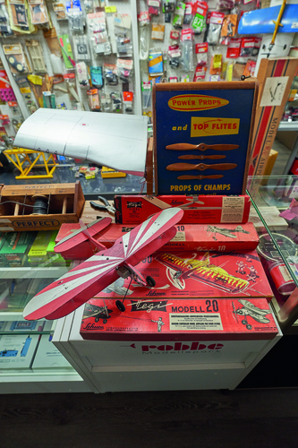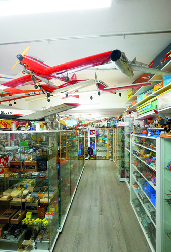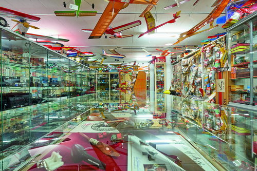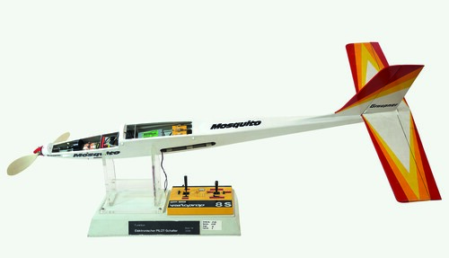Die akribisch strukturierte Sammlung zeigt flugfertige Modelle, dazu Modellmotoren seit 1926 und mehr als 500 Funkfernsteuerungen von den frühesten Anfängen bis heute. Dazu eine Vielzahl an originalen Baukästen legendärer Modellbaumarken wie Graupner, Robbe, Hegi, Multiplex, Simprop, Schlüter. Zur Einordnung der damaligen Dimension: Allein Graupner stellte von jedem seiner Modelle mindestens 30.000 Bausätze her. Viele dieser Firmen sind wieder verschwunden, denn die Modellflugszene hat sich stark gewandelt. In den 1970ern und 1980ern boomte der Modellflug jedoch in Europa. In ungezählten Vereinen oder einfach auf der nächsten freien Wiese wurden Fesselflug, bei der das Modell an einer Stahllitze „gefesselt“ im Kreis um den Piloten fliegt, Freiflug und natürlich funkferngesteuerte Segel-, Motor- und Hubschrauber-Modelle betrieben.