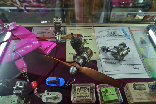 Alle Museumsexponate sind fein säuberlich katalogisiert und dokumentiert. So hat der Schweizer auch seltene Einzelstücke aus der Frühzeit der Modellmotoren in seiner Sammlung, etwa einen Kratmo 10A mit zehn Kubikzentimeter Hubraum von 1938 aus Deutschland. Oder einen Diesel-Selbstzünder aus der Schweiz nach einem Patent von 1928. Aber auch etliche Hirtenberger-Modellmotoren der 1970er-Jahre aus Österreich sind in den Vitrinen zu bestaunen. Ebenso Zwei- oder Viertakter und sogar Wankel der einstigen „Großen Drei“ unter den Modellmotorenhersteller, das waren O.S. und Enya aus Japan sowie Webra aus Deutschland.