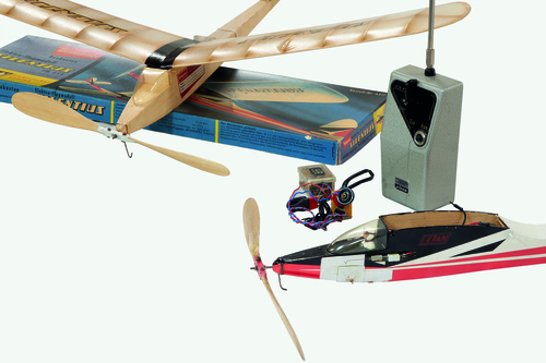 Dazu finden sich viele auch ganz frühe Funkfernsteuerungen seit 1947. Die hatten damals das Format eines Aktenkoffers und erlaubten anfangs nur die Steuerung des Seitenruders am Modell. Mit einer Tipptaste am Sender wurde der Impuls gegeben, eine Rudermaschine im Modell ging dann auf Vollausschlag. Die Technik wandelte sich bald rasant. Mit Einführung der proportionalen Fernsteuerungen ab den 1960er-Jahren gelang es, die Modelle genau wie das Original feinfühlig mit Höhen-, Seiten- und Querruder sowie einer Motordrosselung zu steuern.