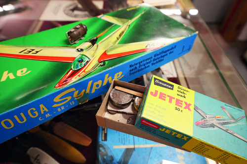 Selbst Jet-Flugmodelle finden sich in seinem Museum. Aber nicht etwa Düsenflieger mit Kleinturbine, sondern ein Raketenflugmodell nach dem Vorbild der französischen Fouga Sylphe aus dem Jahr 1962. Damals wurden unter dem Namen „Jetex“ kleine Raketenmotoren angeboten. Die darin eingesetzten Treibsätze wurden mit Hilfe einer Zündschnur gestartet. Sobald das Triebwerk loslegte, wurde das Modell der Fouga Sylphe aus der Hand in die Luft geworfen. Es sauste im Freiflug zischend gen Himmel, bis der Treibsatz abgebrannt war.