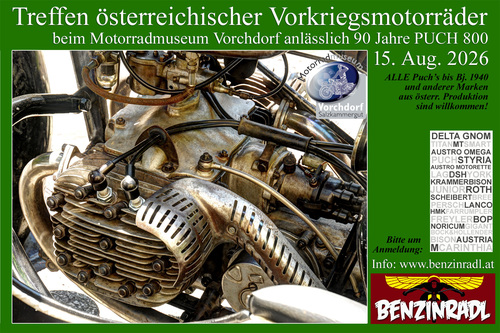 Wer die P 800 in natura sehen und mehr über sie erfahren will, kommt am 15. August 2026 zum 2. Treffen österreichischer Vorkriegsmotorräder beim Motorradmuseum Vorchdorf, das 2024 bei der ersten Austragung im Zeichen 100 Jahre Delta Gnom stand – wir haben berichtet. Diesmal ist der 90te Geburtstag der Puch P 800 das Thema; die Veranstalter bemühen sich, so viele Exemplare wie möglich aufs Gelände zu bekommen.