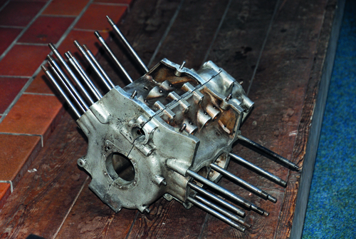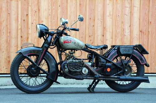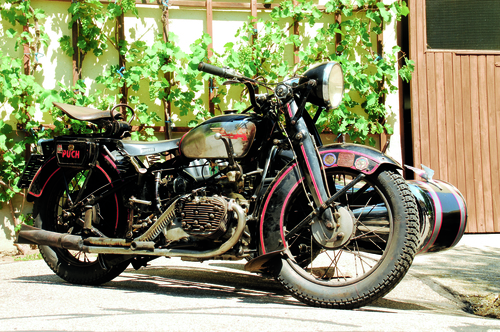 Die 800er Puch hat erstens den einzigen in der Marcellino-Ära selbst entwickelten Viertaktmotor (für die 500er aus 1929 wurde ja ein JAP-Aggregat aus England angekauft), und dann noch dazu ein Vierzylinder! Etwas Vergleichbares bekam man nur bei Zündapp, und genau bei dieser Nürnberger Marke hatten sich die österreichischen Behörden auch bedient gehabt, bevor die Nationalsozialisten Exportbeschränkungen verhängt hatten. Natürlich wollte der geschäftstüchtige Marcellino mit Puch in die Bresche springen und weil die geplante 750er Zweizylinder-Boxer wegen zu starker Vibrationen nicht in Serie gehen konnte, entwickelten die Grazer gleich ein neues Projekt: die P 800! Scheinbar wieder ein seitengesteuerter Boxer, der aber mit einem Öffnungswinkel von 170° in Wahrheit ein extremer Weit-Winkel-V ist. Das sehr laufruhige Aggregat leistete 20 PS bei 4000 U/Min, die Gemischaufbereitung besorgte ein zentral auf dem Motor angebrachter Solex-Vergaser. (Die anfangs verwendete Eigenentwicklung wurde wegen zu ,großen Durstes‘ rasch wieder aufgegeben.) Das Viergang-Getriebe wurde mittels Schaltautomat betätigt – nach erfolgtem Gangwechsel rastete der Handhebel wieder auf neutral ein.