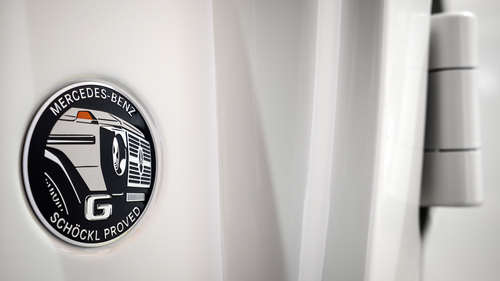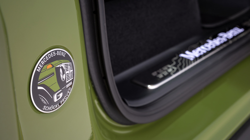 Für einen besonders markanten Offroad-Look des Editionsmodells sorgen ausgewählte Ausstattungsdetails der PROFESSIONAL Line Exterieur. Dazu zählen PROFESSIONAL Schmutzfänger vorn und hinten, PROFESSIONAL Steinschlagschutzgitter2 für die abgedunkelten Scheinwerfer und All-terrain-Reifen2. Optional ist der PROFESSIONAL Dachgepäckträger verfügbar. Außerdem gehört das MANUFAKTUR Logo-Paket in Schwarz zur Ausstattung des Sondermodells. Neben einem schwarzen Türknopf mit Logo-Prägung umfasst es einen Logoprojektor im Außenspiegel. Er begrüßt Fahrerinnen und Fahrer beim Einsteigen mit einer exklusiven Projektion des Schriftzugs „G – STRONGER THAN TIME“ auf den Boden.