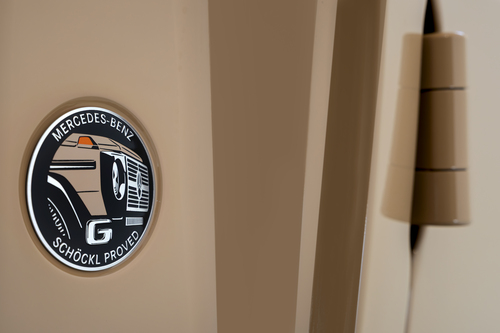 Passend zu den historischen Lackfarben sind die ikonischen Blinker im typischen Orange der damaligen Zeit gehalten. Die Kühlerverkleidung und Fahrzeugfront sowie die Stoßfänger, Radlaufverbreiterungen und die Außenspiegelgehäuse greifen mit ihrer Lackierung in Nachtschwarz magno den robusten Look der ersten G-Klasse auf. Der technische Unterbodenschutz ist ebenfalls in Schwarz ausgeführt. Die G-Klasse Edition STRONGER THAN THE 1980s rollt auf klassischen Leichtmetallräder im 5-Speichen-Design. Der Mercedes Stern auf der Motorhaube ist im Design des historischen Emblems mit Mercedes-Benz Schriftzug und Lorbeerkranz auf blauem Untergrund gehalten. Das Heck ziert ein Originalteil aus den 1980er-Jahren – die silberne Markenplakette mit schwarzem Mercedes-Benz Schriftzug sowie eine editionsspezifische Ersatzradabdeckung.
