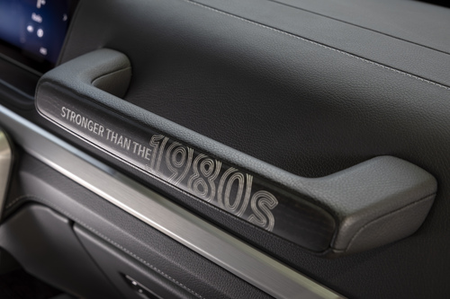 Auch das Interieur der G-Klasse Edition STRONGER THAN THE 1980s zitiert die Anfangszeit der Offroad- Ikone. Der Sitzspiegel der schwarzen Ledersitze ist mit dem damals beliebten taubengrauen Stoff bezogen. Die Zierblende des Haltegriffs auf der Beifahrerseite trägt den Schriftzug „STRONGER THAN THE 1980s“. Auf den Einstiegsleisten vorne ist die Topografie des Hausbergs Schöckl bei Graz mit der Teststrecke zu sehen, auf der die G-Klasse seit 1979 ihre außergewöhnliche Geländegängigkeit beweist. Die traditionelle „Schöckl Proved“-Plakette am Fuß der B-Säule ist im Look der 1980er-Jahre gehalten. Sie zeigt ein historisches G-Modell in der jeweiligen Wagenfarbe. Jedes Fahrzeug verfügt zudem über einen „1 of 460“-Schriftzug auf der Mittelkonsole. Er unterstreicht zusätzlich die Exklusivität dieser G-Klasse. Ein Multifunktionslenkrad in Leder Nappa, ein elektrisches Schiebedach in Glasausführung und das Burmester® 3D-Surround-Soundsystem runden die Interieur-Ausstattung des Sondermodells ab.