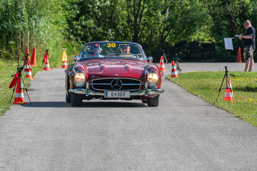 Zu fahren waren 14 Timingprüfungen mit Lichtschranken und Druckschläuchen, mit insgesamt 65 Messstellen. Die Prüfungen waren zum Teil einfach aufgestellt, aber mit Hirn und Gefühl zu fahren. Fallen gab es keine, geheime Prüfungen auch nicht, aber schräg aufgestellt Messstellen sehr wohl. Trotzdem musste man zwischen den Lichtschranken gut achtgeben und vorausschauend fahren – wenn die Strecken zwischen den Schranken länger werden und die Zeiten kürzer, dann heißt es gefühlvoll und gut überlegt Gas geben. Fritz Jirowsky ist bekannt als „Papst“ der Lichtschranken und Schläuche und dementsprechend stellt er auch die Lichtschranken – stets herausfordernd, aber nie hinterhältig. Unmittelbar nach den Prüfungen bekamen wir schon die Ergebnisse per SMS. Ein schöner Service! Die 21 Schnittprüfungen waren höchst unterschiedlich und ein Beweis dafür, dass die schiere Anzahl an Prüfungen kein Kriterium für eine gelungene Veranstaltung ist. In Summe waren 133,696 km in Schnittprüfungen zu fahren. Das sind immerhin fast 25% der Gesamtstrecke der Rallye! Die Schnitte waren mit 40, 45 und 50 km/h stets passend gewählt und das auch ein 40er Schnitt ohne Navigation sehr sportlich sein kann, wurde wieder mal bewiesen.