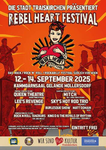 Bei freiem Eintritt steigt von Freitag, 12.9. ab 16 Uhr bis Sonntag, 14.9.25 wieder das „Rebel Heart Festival“ am Kammgarnsaalgelände Möllersdorf, Wolfstraße 18d, 2514 Traiskirchen. Livemusik, Burlesqueshow und natürlich US-Cars und Bikes bilden das stimmungsvolle Rahmenprogramm dieser beliebten Veranstaltung.