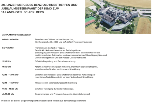Die Interessensgemeinschaft Mercedes Oldtimer feiert ihr 30-jähriges Bestehen mit einem Treffen bei der Firma Pappas, Mayrhoferstraße 36, 4020 Linz am Sonntag, 14.9.25 ab 8 Uhr. En vielfältiges Programm und eine Sternfahrt zum 1A Landhotel Schicklberg, Schicklberg 1, 4550 Kremsmünster, warten auf die Teilnehmer. Startgeld inklusive Package und Verpflegung für Fahrer 55 €, für Beifahrer 25 €. Anmeldung erforderlich.