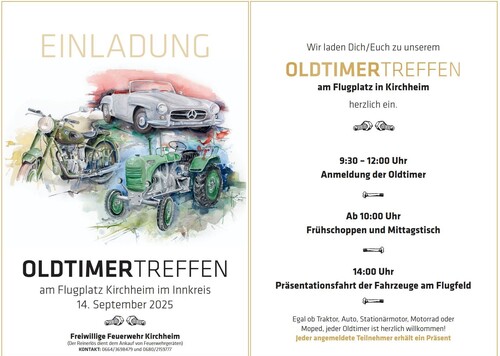Oldtimerfrühschoppen mit Präsentationsfahrt am Sonntag, 14.9.25 ab 9.30 Uhr am Flugplatz 4932 Kirchheim im Innkreis, Schacher 17. Geschenke für alle Teilnehmer!
