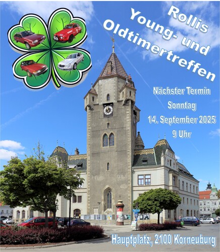 Das Oldtimerfrühstück am Sonntag, 14.9.25 ab 9 Uhr am Hauptplatz beim Rathaus in 2100 Korneuburg. „Rollis Young- und Oldtimer Treffen“ findet monatlich immer am zweiten Sonntag statt! Das Café Grünzweig verwöhnt mit Kaffee und mehr.