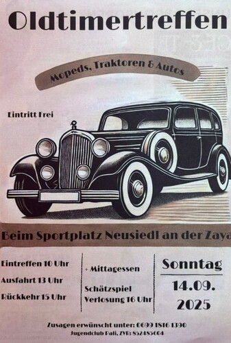 Familiengerechtes Oldtimertreffen mit Ausfahrt, Gewinnspiel und Verlosung am Sonntag, 14.9.25 ab 10 Uhr am Sportplatz in 2183 Neusiedl an der Zaya, Bahnstraße 32 (östlich von Mistelbach). Urkunde für jeden Teilnehmer!