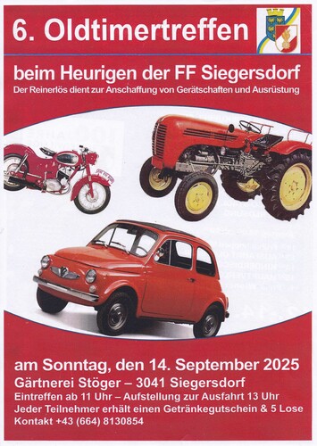 Oldtimertreffen mit Ausfahrt im Rahmen des Feuerwehrfestes bei der Gärtnerei Stöger, Hauptstraße 59, 3041 Siegersdorf (bei Neulengbach), am Sonntag, 14.9.25 ab 11 Uhr.