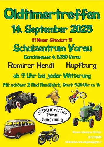 Ländlich geprägtes, familiengerechtes Oldtimertreffen für die ganze Familie am Sonntag, 14.9.25 ab 9 Uhr beim Schulzentrum 8250 Vorau, Gerichtsgasse 4.