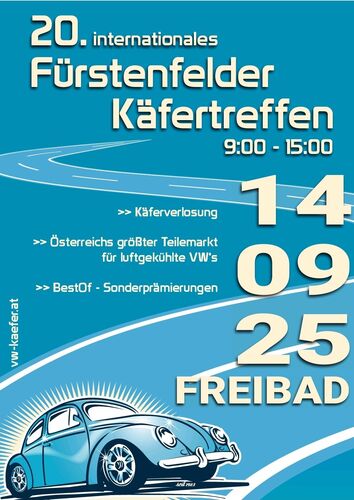 Beim internationalen Käfertreffen am Sonntag, 14.9.25 ab 10 Uhr im Freibad 8280 Fürstenfeld, Badstraße 1, gibt es sogar eines der beliebten Fahrzeuge zu gewinnen! Prämierungen und Teilemarkt bilden das Rahmenprogramm. Nenngeld 15 €.