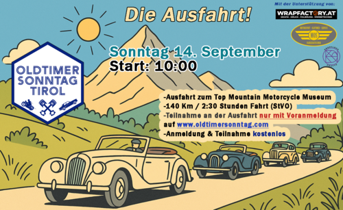 Die Ausfahrt des „Oldtimersonntag Tirol“ am Sonntag, 14.9.25 um 10 Uhr führt diesmal über 140 km zum, nach einem Brand wiedererrichteten, Motorradmuseum „Top Mountain“ Timmelsjochstraße 8, 6456 Gurgl auf fast 2200 Meter Meereshöhe. Der Treffpunkt im Raum Innsbruck wird nach Anmeldung per Mail bekannt gegeben!