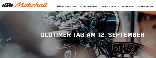 Beim Oldtimertag für Zwei- und Vierräder am Freitag, 12.9.25 ab 12 Uhr bei der KTM – Motohall, KTM Platz 1, 5230 Mattighofen gibts Ermäßigungen für Eintritt und Shop! Führung, Ausfahrt und ein interessanter Vortrag bilden das Rahmenprogramm.