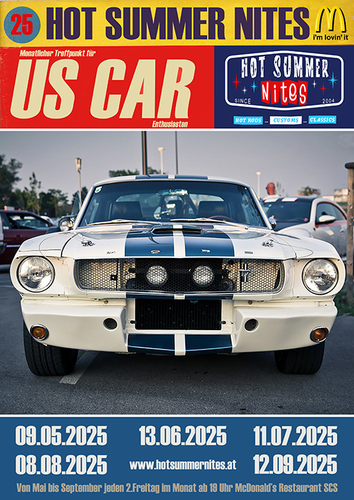 Immer am zweiten Freitag des Monats, 12.9.25, offiziell ab 19 Uhr (viele kommen schon früher), findet der Saisonausklang der „Hot Summer Nites“ vorm Mc Donalds in der SCS am Vösendorfer Westring, 2334 Vösendorf statt. Das beliebte Treffen zieht nicht nur US-Cars von nah und fern an. Alle Informationen über die Parkgebühren am SCS Parkplatz auf der Homepage. Gutscheine vor Ort!