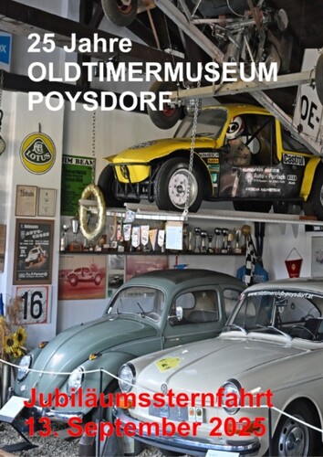 Oldtimertreffen im Rahmen des Winzerfestes beim Oldtimermuseum 2170 Poysdorf, Liechtensteinstraße 68, am Samstag, 13.9.25 ab 13 Uhr anlässlich des 25-jährigen Bestehens. Zufahrt über den Unteren Markt vom Stadtzentrum kommend.