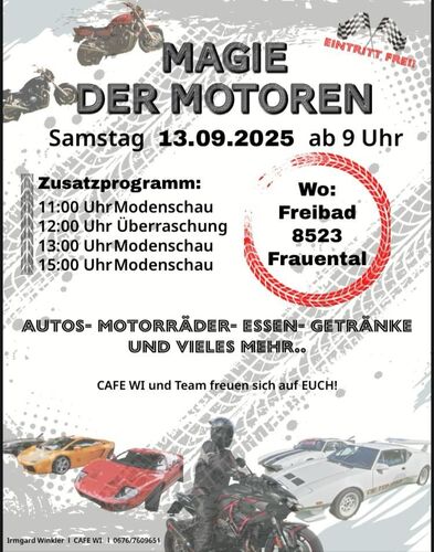 „Magie der Motoren“ nennt sich das Treffen faszinierender Fahrzeuge aller Epochen am Samstag, 13.9.25 ab 9 Uhr beim Freibad in 8523 Frauental an der Lassnitz (südlich von Graz), Badstraße 40. Modenschau und Livemusik bilden das Rahmenprogramm.