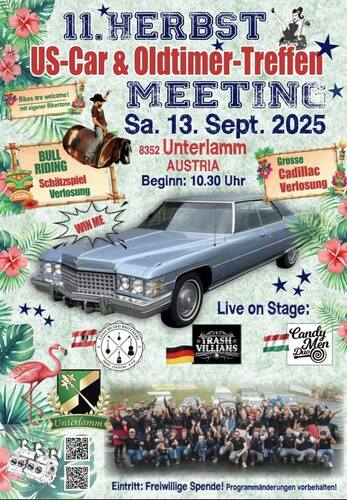 US-Cars & Oldtimer jeglicher Art treffen einander am Samstag, 13.9.25 ab 10.30 Uhr in 8352 Unterlamm 19 (südlich Fürstenfeld) zu einer temporeichen musikalischen Zeitreise in die 50er & 60er mit Live-Musik und umfangreichem Rahmenprogramm samt Gewinnspiel, bei dem es einen Cadillac zu ergattern gilt!