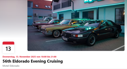 „Eldorado Evening Cruising“ am Donnerstag, 13.11.25 ab 18 Uhr beim Motel Eldorado in Nikolsburg, K Vápence 1871/2c, 69201 Mikulov na Moravě (gleich nach der österreichischen Grenze bei Drasenhofen).
