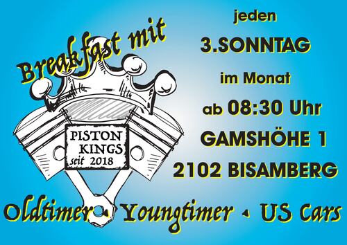 Nächste Ausgabe des "Piston Kings Breakfast", einem markenoffenen Verbrennertreffen, am Sonntag, 18.1.26 ab 8.30 Uhr am Parkplatz beim Gasthaus "Gamshöhe", Gamshöhe 1, 2102 Bisamberg. Immer am dritten Sonntag des Monats!