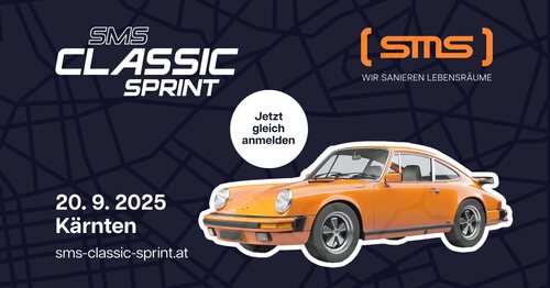 Der „SMS Classic Sprint“ ist ein gemischtes Oldtimer-, Youngtimer- und Sportwagentreffen samt Ausfahrt entlang der Kärntner Seen in drei Kategorien mit und ohne Sonderprüfungen über etwa 120 km am Samstag, 20.9.25 ab 8 Uhr. Treffpunkt ist der Industriepark, SMS-Straße 1, 9065 Ebenthal (südlich von Klagenfurt). Nenngeld ab 65 € für zwei Personen.