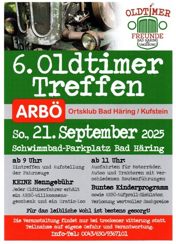 Familienfreundliches Oldtimertreffen mit Ausfahrt am Sonntag, 21.9.25 ab 9 Uhr in 6323 Bad Häring bei Kufstein, Schwimmbadstraße 4. Gratislos und Geschenk für alle Oldtimerfahrer!