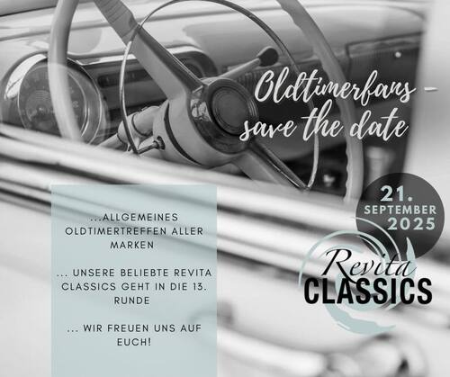 „Revita Classics“ ist ein Oldtimertreffen mit Wertungsfahrt und Preisverleihung am Sonntag, 21.9.25 ab 9 Uhr beim Hotel Kocher in der Stefan-Fadingerstraße 6, 4084 St. Agatha (im Hausruckviertel südlich der Schlögener Schlinge).
