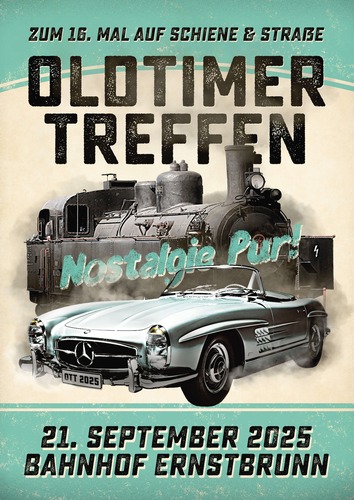 Eine stimmungsvolle Begegnung alter Autos und ebensolcher Eisenbahnen ist das „Oldtimertreffen auf Schiene & Straße“ am Sonntag, 21.9.25 ab 9 Uhr beim Bahnhof in der Hirschmillerstraße 42, 2115 Ernstbrunn. Zu Mittag gibt’s eine Ausfahrt und die Fahrzeugprämierung. Das Festgelände in Ernstbrunn und der Bauernmarkt Simonsfeld sind durch einen Nostalgiebus verbunden. Dort warten Köstlichkeiten aus den Kellern und Küchen des Weinviertels. Wer mit dem Dampfzug an/abreisen möchte (Abfahrt 9.23 Uhr am Praterstern in Wien, 11.20 Uhr Ankunft Ernstbrunn), bezahlt für das umfangreiche Package ab 50 €. Anmeldung erbeten!