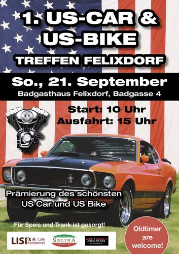 Das US-Car- und Bike Treffen beim Freibad in der Badgasse 4, 2603 Felixdorf (nördlich von Wiener Neustadt) ist ein neues Treffen. Premiere am Sonntag, 21.9.25 ab 10 Uhr. Geplant sind eine gemeinsame Ausfahrt samt Prämierung per Publikumswahl für das jeweils schönste Auto und Bike.