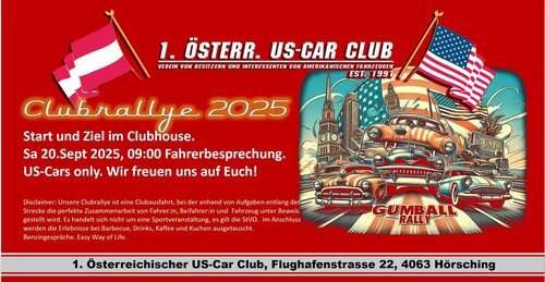 Bei der Clubrallye des 1. Österreichischen US-Car Clubs in der Flughafenstraße 22, 4063 Hörsching sind in diesem Jahr erstmals auch Gäste (mindestens zwei Personen pro US-Car) herzlich willkommen! Start und Ziel beim stilvollen Clubhaus im Westernstil am Samstag, 20.9.25 ab 9 Uhr. Bei der abschließenden Grillparty werden die Sieger geehrt! Nenngeld 25 € pro Fahrzeug. Anmeldung erforderlich!