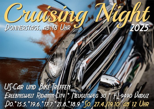 Die „Cruising Nights“ am Donnerstag, 18.9.25 ab 18 Uhr sind ein US-Car- und Biketreffen am Parkplatz der Erlebniswelt Ridamm-City, Neugutweg 30, in 9490 Vaduz. Von April bis Oktober immer am dritten Donnerstag des Monats.