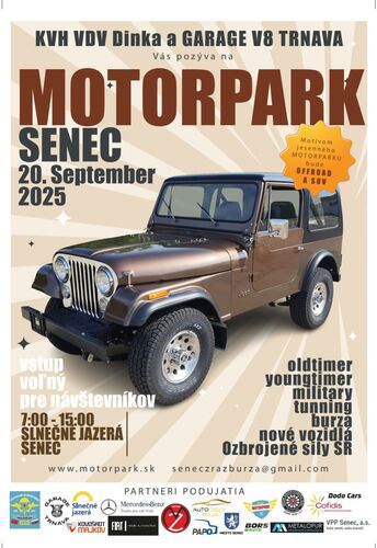 30 km östlich von Bratislava findet in Slnečné jazerá 2599/159, 90301 Senec, am malerischen See am Samstag, 20.9.25 ab 7 Uhr früh das Old- und Youngtimertreffen „Motorpark“ samt Teilemarkt statt.