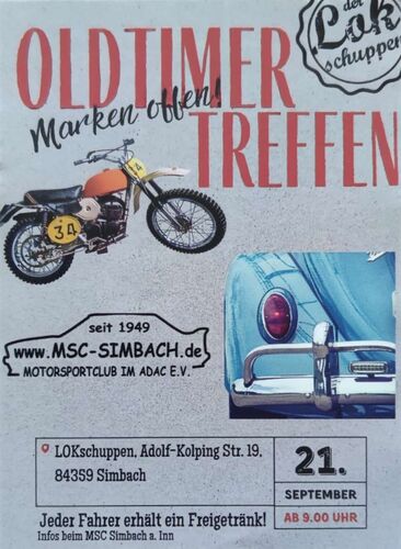 Oldtimertreffen am Sonntag, 21.9.25 ab 9 Uhr beim Lokschuppen, Adolf-Kolping-Straße 19, in 84359 Simbach am Inn (bei Braunau). Freigetränke für alle Fahrer!