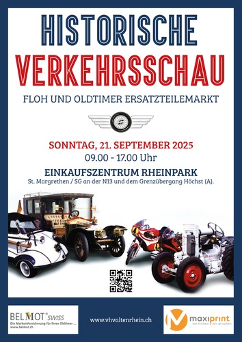Oldtimertreffen „Historische Verkehrsschau“ im Dreiländereck D/A/CH auf Schweizer Seite beim Einkaufszentrum Rheinpark, Neudorfstraße 60, 9430 St. Margrethen am Sonntag, 21.9.25 ab 9 Uhr.