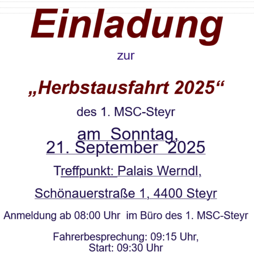Herbstausfahrt des 1. MSC Steyr am Samstag, 20.9.25 für Motorräder mit und ohne Beiwagen, Old-, Youngtimer und Cabrios. Treffpunkt ab 8 Uhr beim Palais Werndl, Schönauerstraße 7, 4400 Steyr. Anmeldung per WhatsApp an 0676 5533107 oder per Mail an msc.steyr@gmail.com.