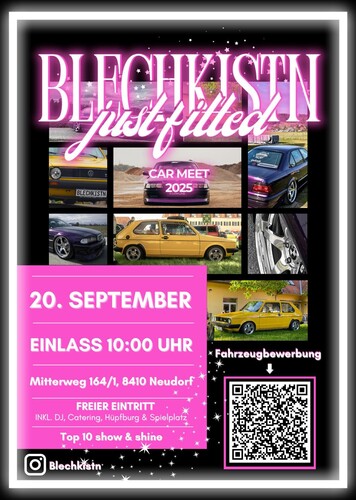 „Blechistn Just Fitted“ ist der kreative Titel eines familiengerechten Treffens mit Bewertung von Stance-Cars bis zu restaurierten Klassikern am Samstag, 20.9.25 ab 10 Uhr in 8410 Neudorf ob Wildon (südlich von Graz), Mitterweg 164/1.