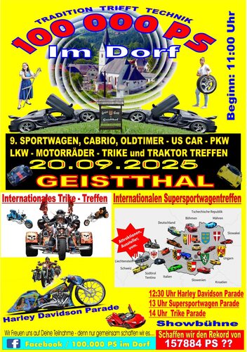 Mindestens „100.000 PS“, verbaut in Oldtimern, Trikes, Traktoren & Sportwagen, wollen die Veranstalter am Samstag, 20.9.25 ab 11.30 Uhr wieder in das kleine Dorf 8153 Geistthal (zwischen Graz und Bruck an der Mur) locken. Wird der Rekord von 157.884 PS gebrochen?