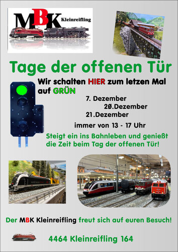 Tag der offenen Tür beim Modellbahnklub in 4464 Kleinreifling 164 (südlich Waidhofen an der Ybbs) am Samstag, 20.12.25 und Sonntag, 21.12.25 jeweils ab 13 Uhr.