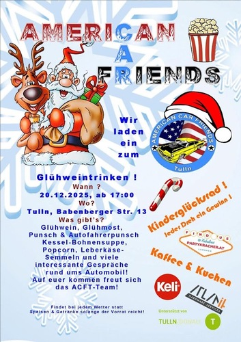 Die „American Car Friends“ bitten am Samstag, 20.12.25 ab 17 Uhr zum vorweihnachtlichen Glühwein und anderen Köstlichkeiten nach 3430 Tulln, Babenbergerstraße 13. Beheiztes Zelt! Kinderglücksrad! Bring your family!