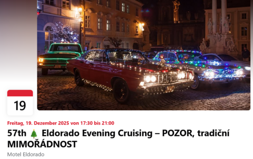 Weihnachtsausgabe des „Eldorado Evening Cruising“ am Freitag, 19.12.25 ab 17.30 Uhr beim Motel Eldorado in Nikolsburg, K Vápence 1871/2c, 69201 Mikulov na Moravě (gleich nach der österreichischen Grenze bei Drasenhofen) diesmal mit Präsentation der dekorierten Fahrzeuge am Hauptplatz.