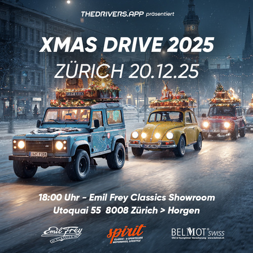 XMas Drive am Samstag, 20.12.25 ab 18 Uhr. Rundfahrt um den See mit geschmückten Fahrzeugen zur Motorcom Garage in Horgen zum Drivers Fondue. Treffpunkt: Emil Frey Classics Showroom, Utoquai 55, 8008 Zürich-Seefeld.