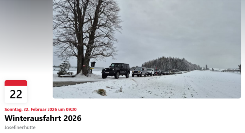 Ob historisch oder nicht, Hauptsache geländetauglich! Der Club „Allrad Wien“ lädt am Sonntag, 22.2.26 bei seiner „Winterausfahrt“ zum Durchpflügen der Waldwege und Besichtigung des Stiftes Klosterneuburg. Treffpunkt ist um 9.30 Uhr bei der Josefinenhütte am Waldseilparkplatz Kahlenberg auf der Höhenstraße, Josefsdorf 47, 1190 Wien. Unkostenbeitrag 25 €. Rasche Anmeldung und geländegängiges Fahrzeug erforderlich!