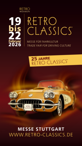 Die Oldtimermesse „Retro Classics“ am Messegelände in 70629 Stuttgart, Messepiazza 1, ist praktischerweise zu Fuß vom Flughafen, und direkt an der A8 gelegen, leicht zu erreichen. Sie bietet von Donnerstag, 19.2. bis Sonntag, 22.2.26 in sieben Hallen hochkarätige Klassiker aller Epochen, Rennsport hautnah und viele einzigartige Sonderschauen. Selbstverständlich gibt es auch wieder einen Teilemarkt, eine Fahrzeugverkaufsbörse und eine Auktion am Samstag um 15 Uhr. Geöffnet am Donnerstag von 11-19 Uhr (danach gibt’s „Party“ bei der „Retro Night“), Freitag bis Sonntag 10-18 Uhr. Tageseintritt ab 25 €.