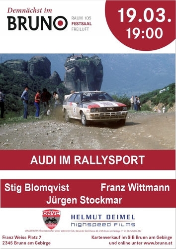Filmvortrag von Helmut Deimel am Donnerstag, 19.3.26 ab 19 Uhr im Veranstaltungszentrum Bruno in 2345 Brunn am Gebirge, Franz-Weiss-Platz 7, zum Thema „Audi im Rallysport“ mit prominenten Gästen, wie Stig Blomqvist, Franz Wittmann und Franz Wurz. Eintritt 28 €.