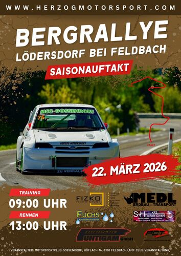 Saisonauftakt zum Bergrallye-Cup am Sonntag, 22.3.26 ab 9 Uhr in 8334 Lödersdorf bei Feldbach. Die Cupsieger werden 2026 in 8 Rennen in fünf Klassen, darunter eine für historische Tourenwagen, ermittelt. Von etwa 80 Teilnehmern werden pro Veranstaltung zwei Trainingsläufe und drei Kurz-Bergrennen mit einer maximalen Streckenlänge von 2000 Meter gegen die Uhr gefahren.